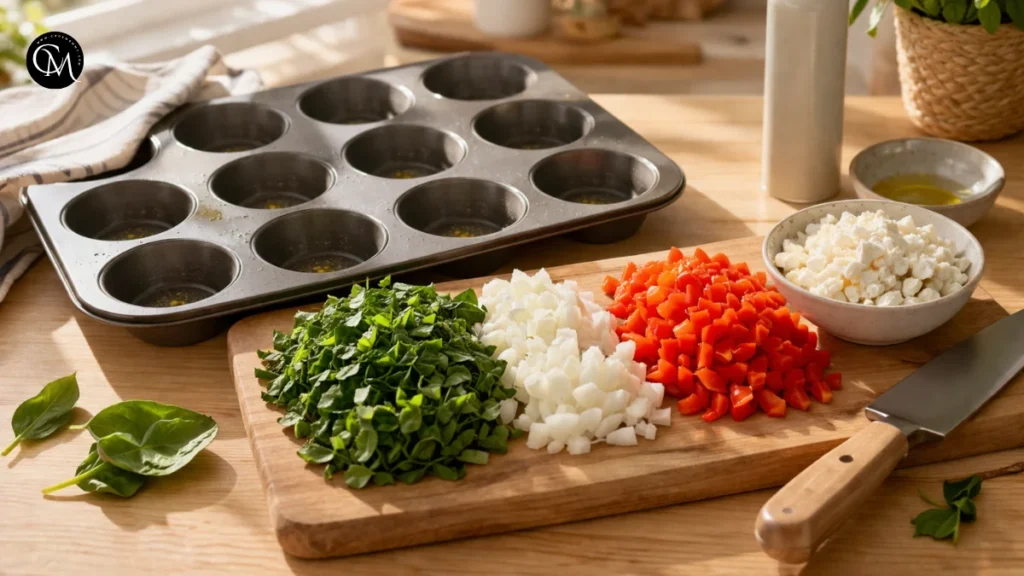 Preparation matters more than people think. When the vegetables are cut small and evenly, they cook more quickly and distribute better in the egg mixture. That means each muffin gets a balanced bite instead of one being full of feta while another has only egg.