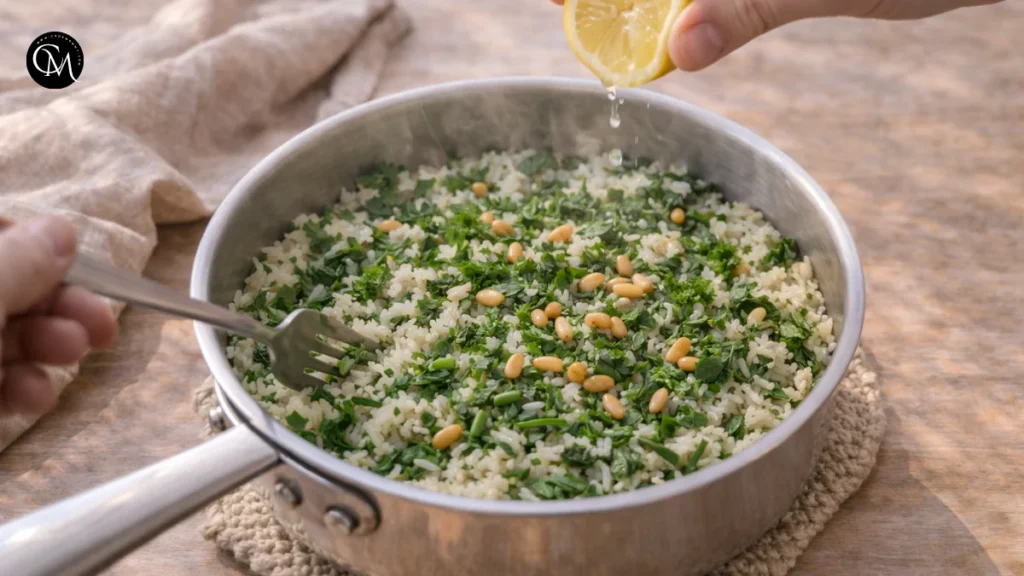 This finishing step is what makes the dish taste alive. Rice can absorb a lot of seasoning, so a final adjustment is often necessary. Lemon sharpens the flavors and keeps the spinach from tasting heavy. My chef-style tip is to season in layers but always do one last taste at the end. That final tweak turns a decent Spinach Rice Recipe into one people actually remember.
