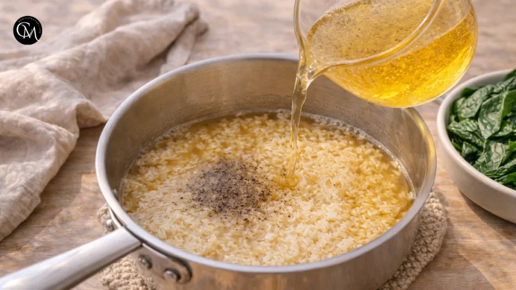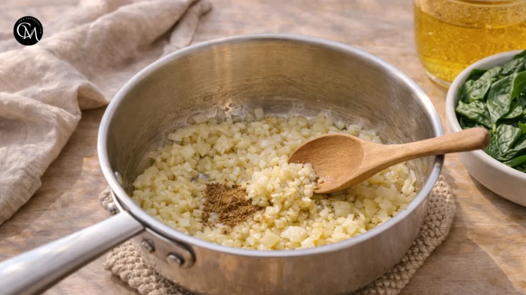 This is where the dish develops its backbone. Onions release sweetness as they soften, and garlic blooms in hot fat, creating a deeper aroma than if it were simply boiled with the rice. A good Spinach Rice Recipe tastes layered because the flavor starts in the pan, not just in the broth. Do not rush this step. Pale onions give you less sweetness, while burnt garlic can make the whole pot taste bitter.