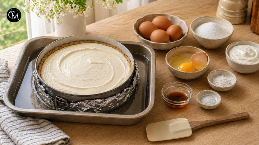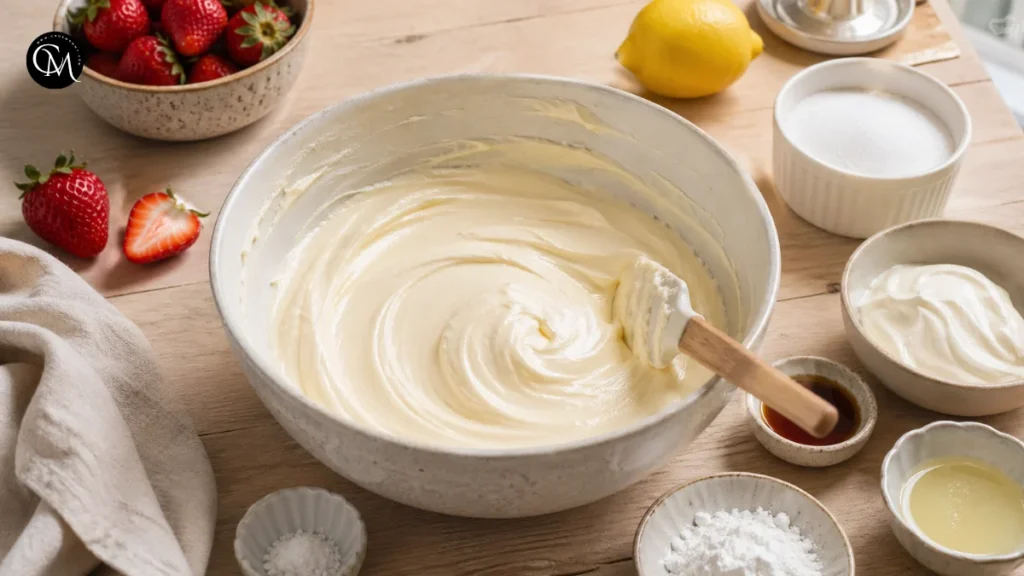 Start by bringing the cream cheese, eggs, and sour cream to room temperature. This step matters more than many bakers realize. Cold cream cheese does not blend smoothly, and overmixing to fix lumps can add too much air to the filling.