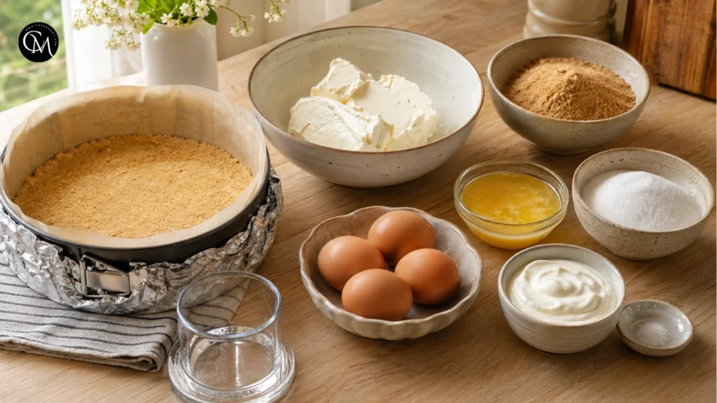 For the crust, mix graham cracker crumbs, melted butter, sugar, and salt until the texture feels like damp sand. Press it firmly into the bottom of the pan using the base of a measuring cup. Bake the crust for 8–10 minutes, then let it cool slightly.