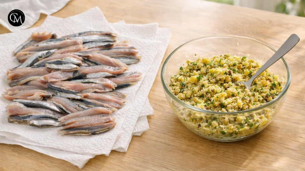 This step matters more than people think. Excess moisture makes the filling soggy and prevents the fish from holding together neatly. I always lay the cleaned anchovies on paper towels for a few minutes before assembling. It is a small habit, but it improves texture and helps the dish cook evenly.