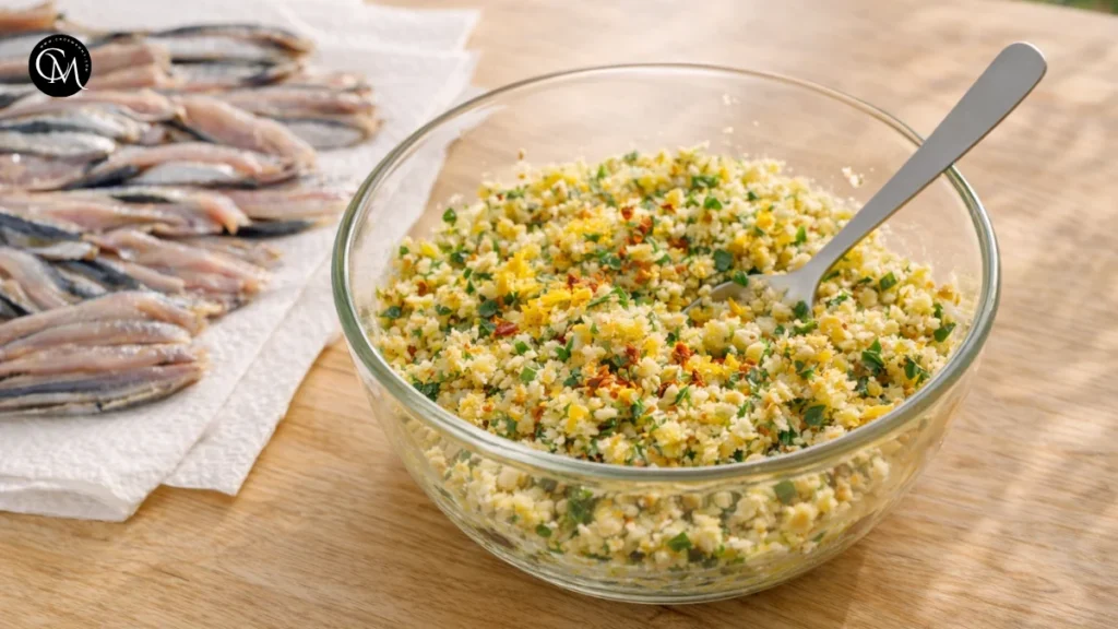 The filling is the flavor engine of Stuffed Anchovies, so balance is everything. The breadcrumbs absorb the natural juices of the fish. The cheese brings umami. Garlic adds depth, while lemon zest lifts the entire mixture.