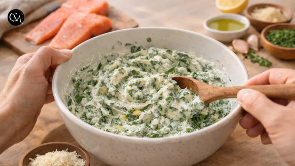 Mix cream cheese, spinach, Parmesan, garlic, herbs, lemon zest, and seasoning until smooth. The goal is even distribution so every bite tastes balanced. Letting the mixture sit for 2–3 minutes softens the herbs and blends flavors.