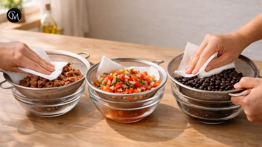 Drain salsa, beans, and cooked meat well using a sieve or colander. If they still look glossy or watery, gently pat them dry with paper towels.