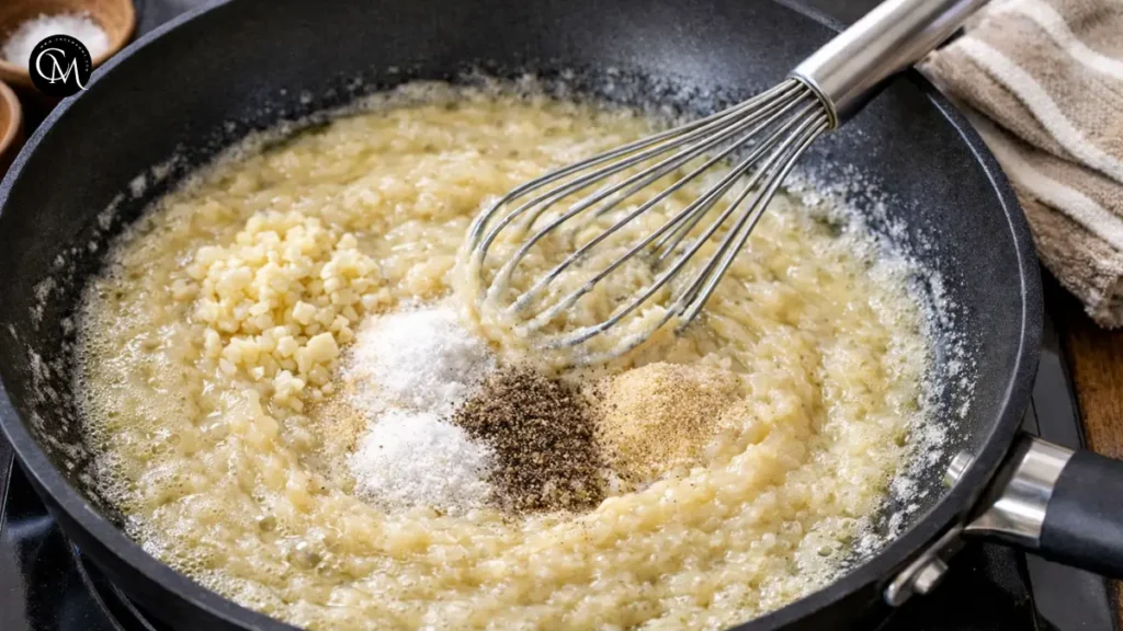 Add the minced garlic and let it cook briefly about 30 seconds until its aroma deepens. Add salt, pepper, and onion powder. The heat will bloom these spices and infuse them deeply into the base.