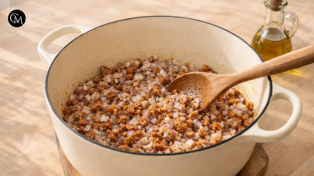 Why this matters: Browning the sausage isn’t just about cooking it through it creates layers of flavor. The caramelized bits that stick to the bottom of the pot (called fond) dissolve later into the broth, giving the soup a richer, more savory base.
